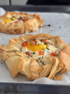 שוברים לתוך כל עיגול ביצה, מוסיפים גבינה צהובה ותבלינים ואופים בערך 5-8 דקות עד להזהבה.