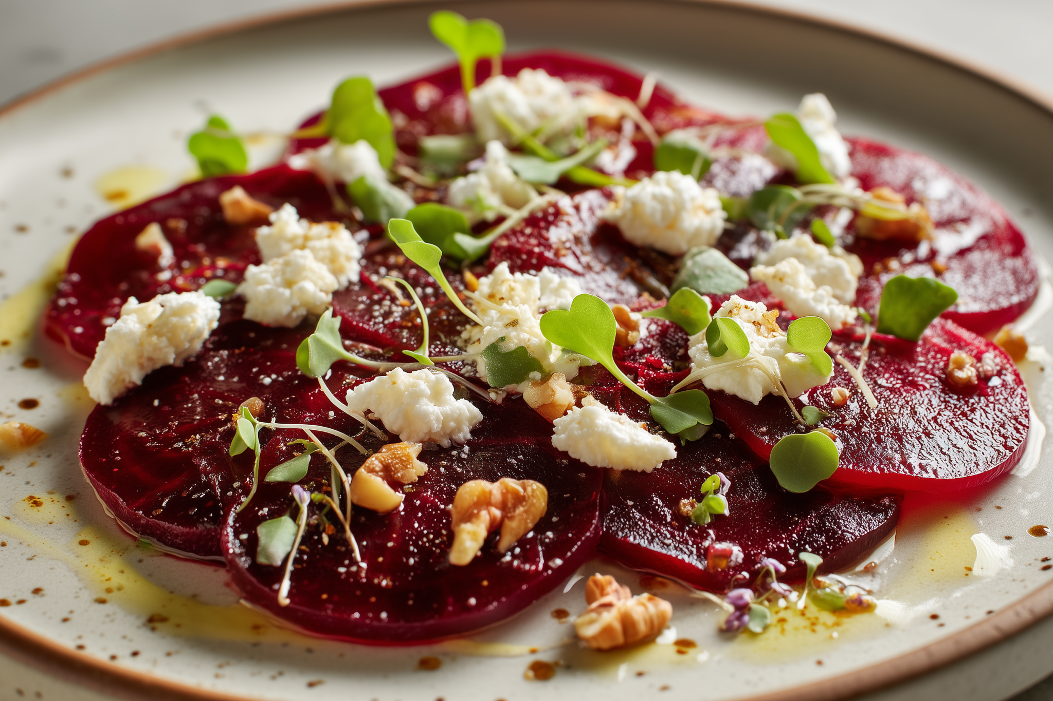 על צלחת גדולה מסדרים את פרוסות הסלקים בצורה חופפת אחת אחרי השנייה ככה שהן מכסות כמעט את כל הצלחת.