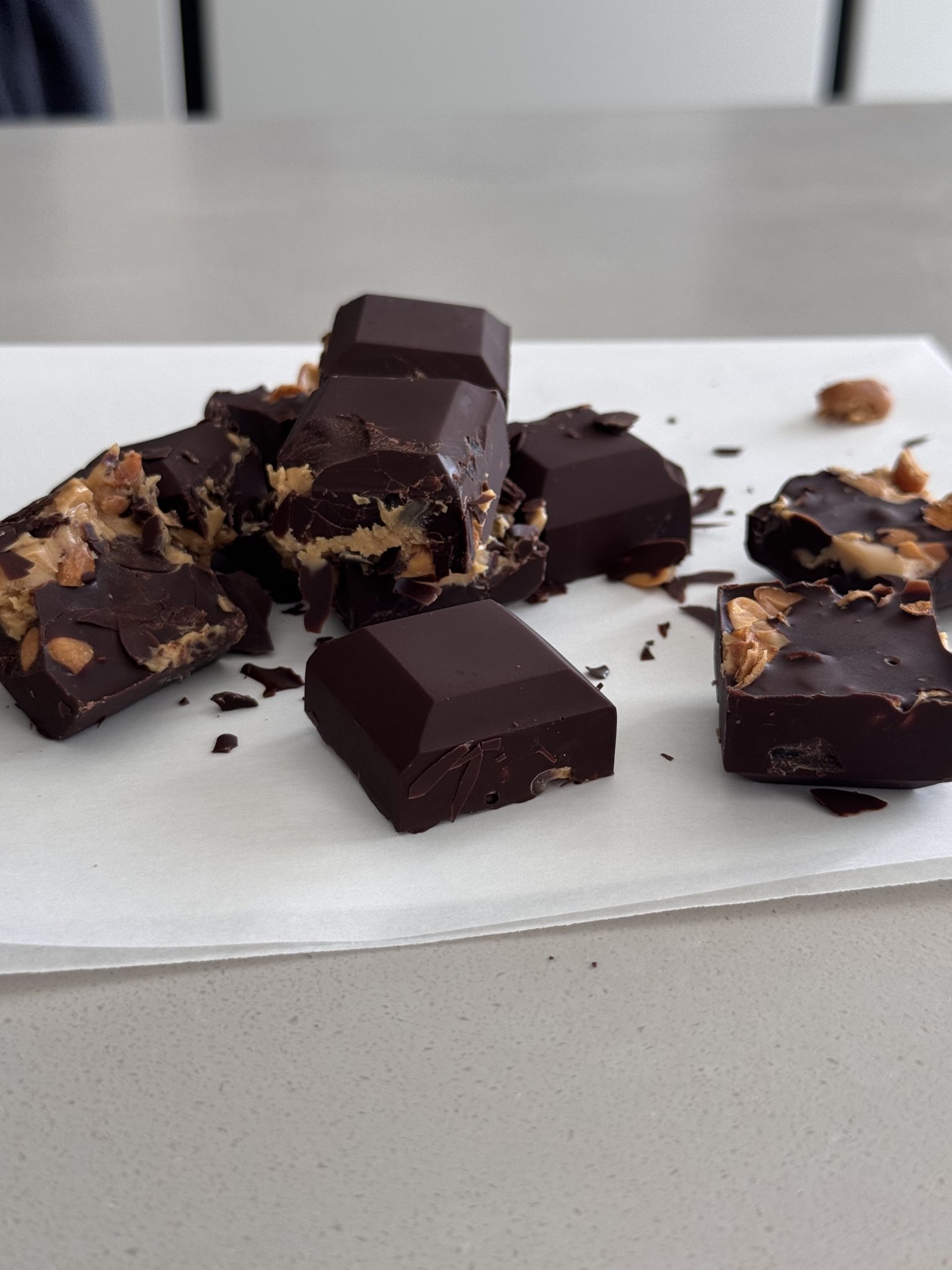 לתבניות סיליקון מניחים את המצרכים לפי הסדר הבא: כף שוקולד מריר מומס, חצי תמר, כפית חמאת בוטנים, כפית בוטנים קצוצים ושוב כף שוקולד מריר מומס.